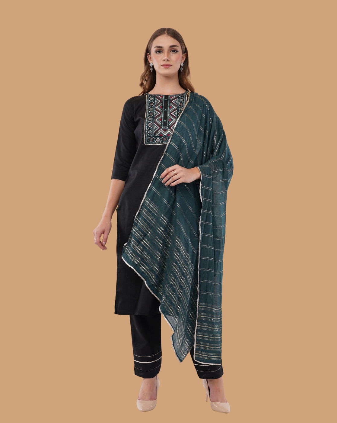 This sophisticated set features a beautifully tailored kurta highlighted with intricate embroidery around the neckline, adding a refined artisanal touch. The matching straight-fit salwar offers all-day comfort, while the lightweight contrasting dupatta with subtle woven stripe detailing completes the look with effortless charm.