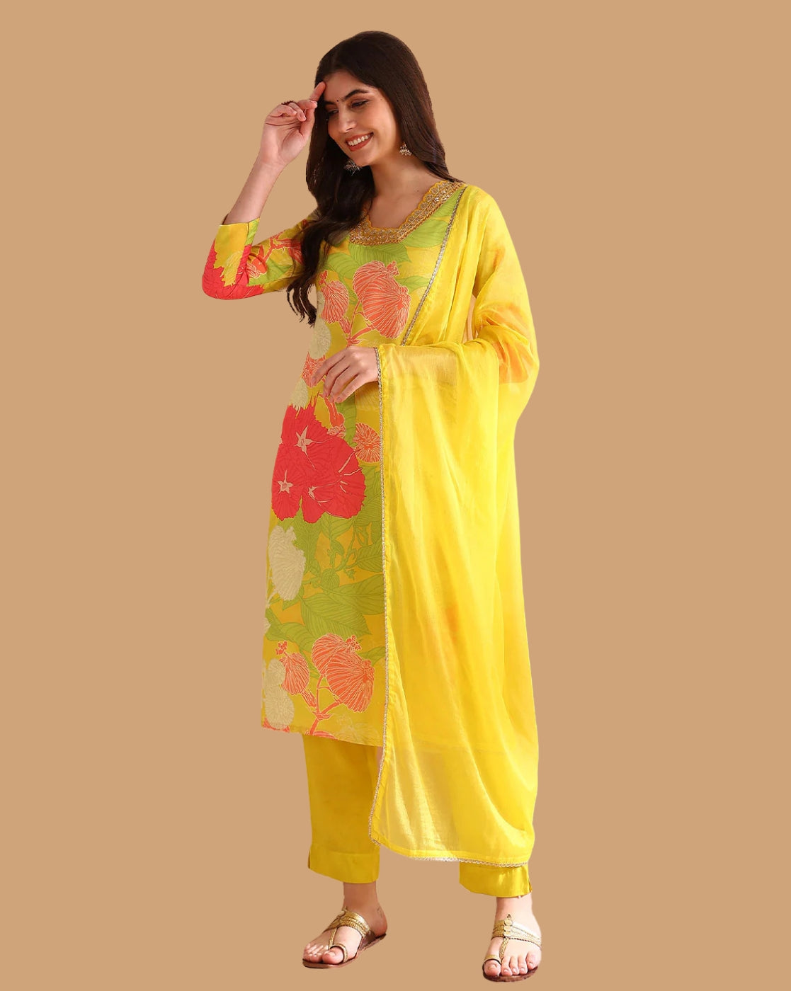 The kurta features a vibrant floral print with intricate detailing around the neckline, adding a touch of festive finesse. Paired with a comfortable straight-fit salwar and a lightweight flowing dupatta, this ensemble creates a graceful silhouette that moves beautifully with you.