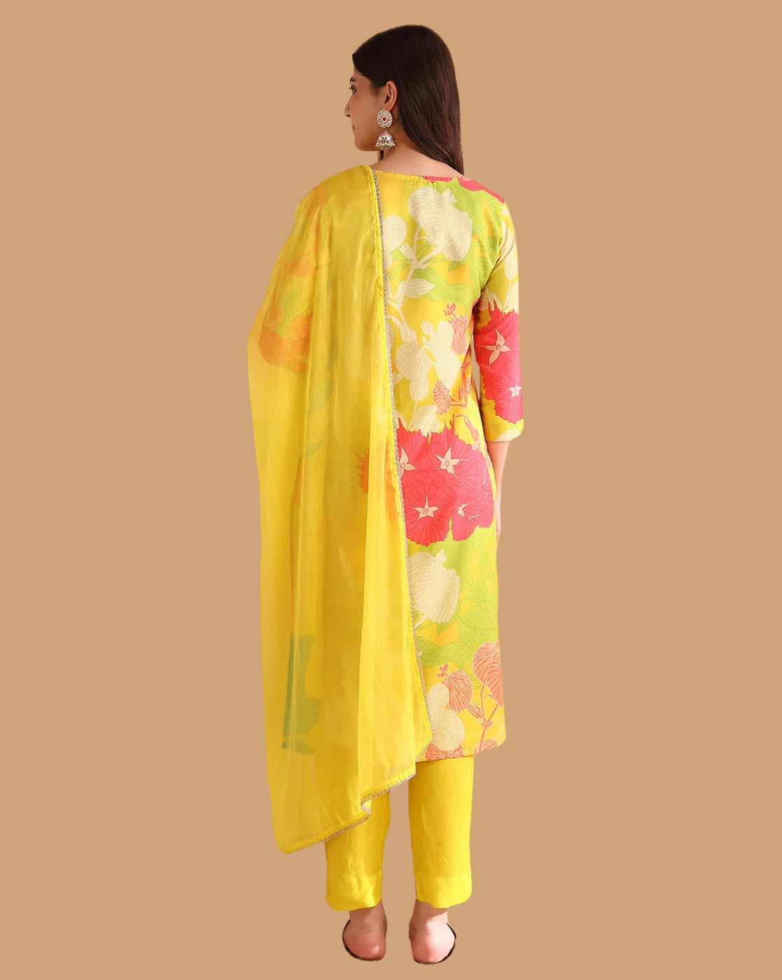 Brighten your ethnic wardrobe with the joyful charm of the Roopaasi Lemon Yellow Floral Printed Salwar Kurta Set with Dupatta. Designed to celebrate colour, comfort, and contemporary elegance, this outfit is perfect for women who love expressive ethnic fashion.