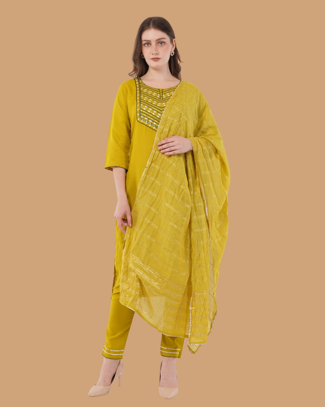 This sophisticated set features a beautifully tailored kurta highlighted with intricate embroidery around the neckline, adding a refined artisanal touch. The matching straight-fit salwar offers all-day comfort, while the lightweight dupatta with subtle woven stripe detailing completes the look with effortless charm.