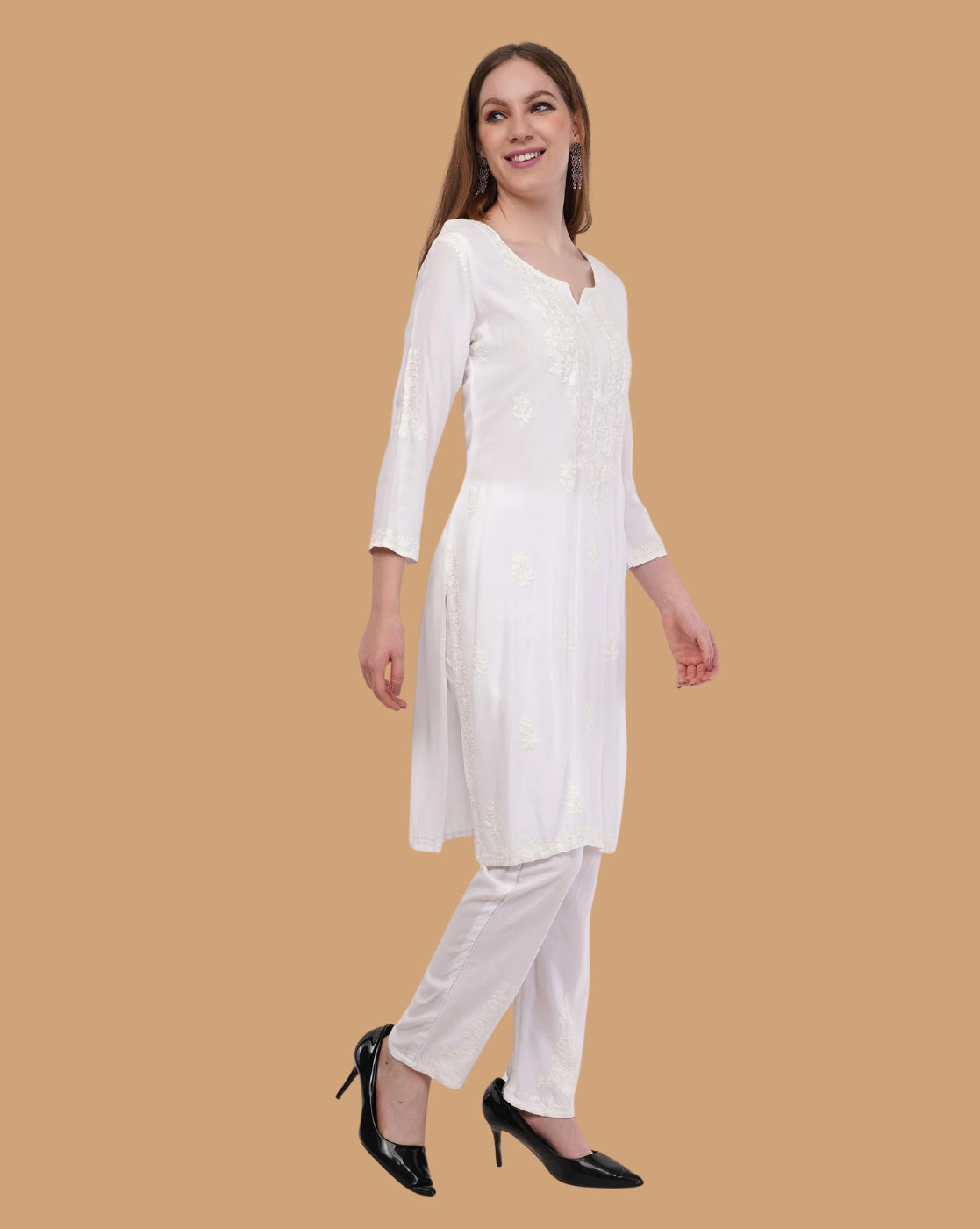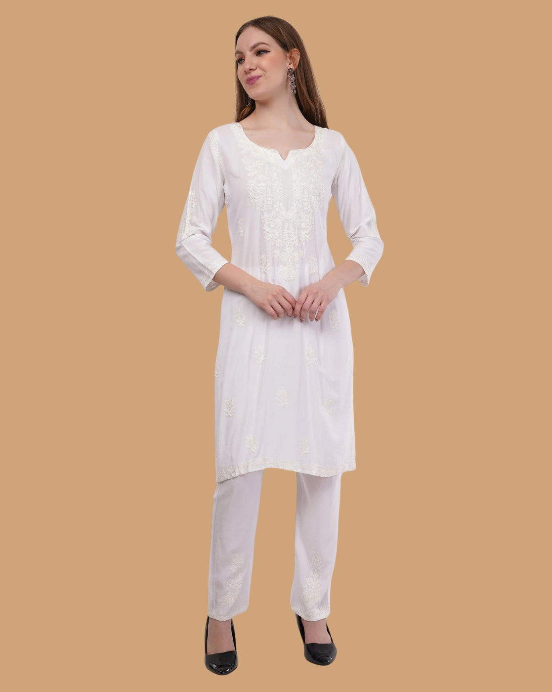 Elevate your ethnic wardrobe with the timeless charm of the Roopaasi White Embroidered Salwar Kurta Set, crafted for women who appreciate refined elegance and everyday comfort.