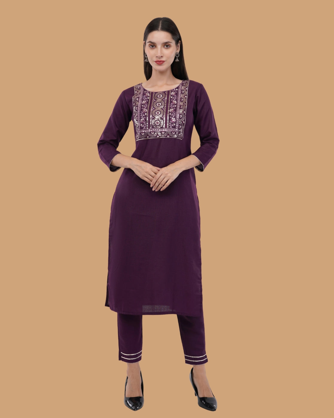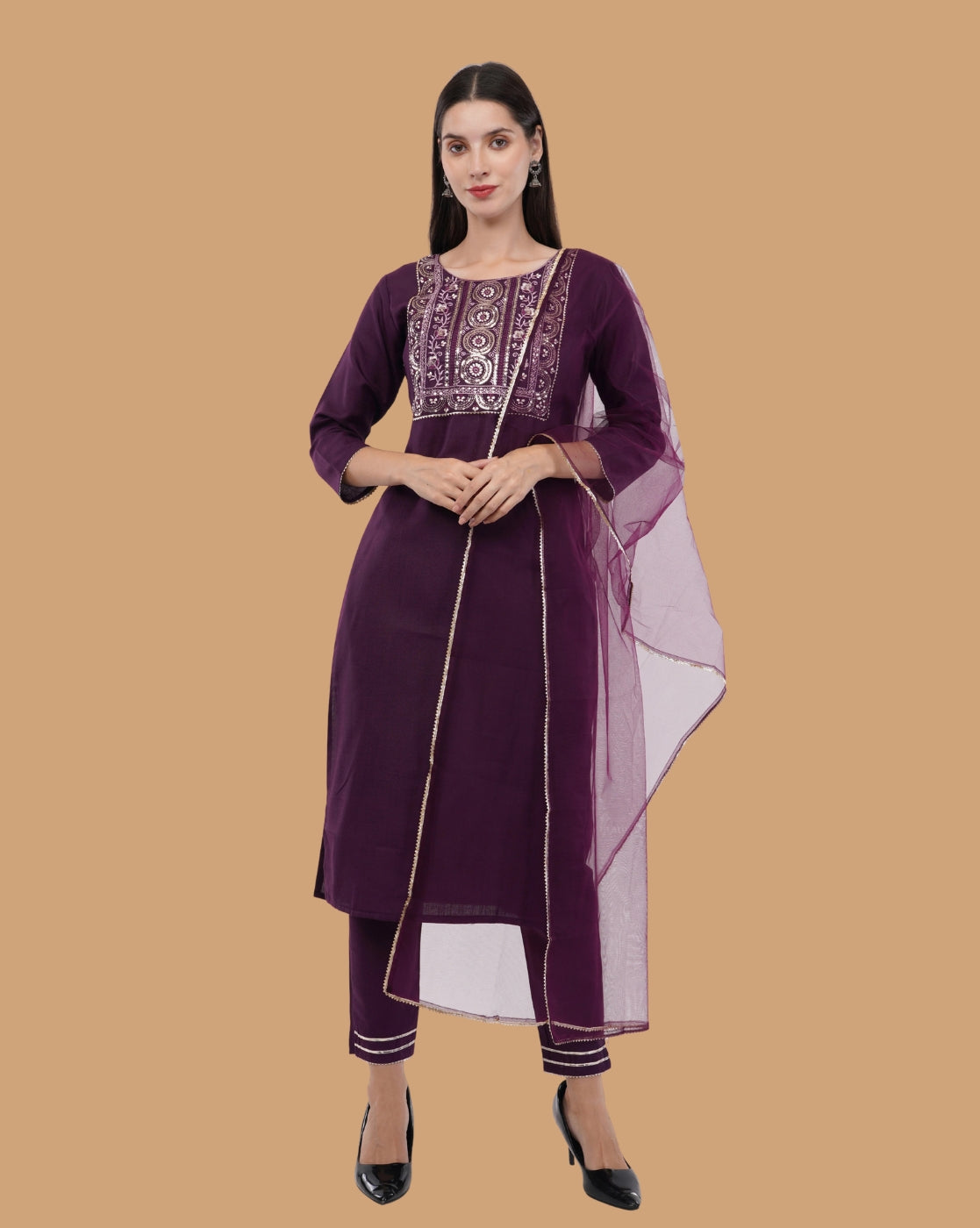 The kurta features delicate embroidery and mirror-inspired detailing around the neckline, adding subtle shimmer and artisanal charm. Crafted in a graceful straight silhouette, it is paired with a comfortable fitted salwar and a sheer, lightweight dupatta that drapes beautifully, enhancing the overall sophistication of the ensemble.